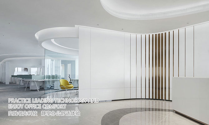 办公室装修公司案例:整体办公空间设计中,大气与细致并存,将设计与艺术结合。设计理念: 室内设计元素均交织凝聚于行云流水的曲线流动空间,设计表现形式不受拘束,每个空间都有自己特殊的弧度,致力于搭建“创新+智能+生态”的办公环境。